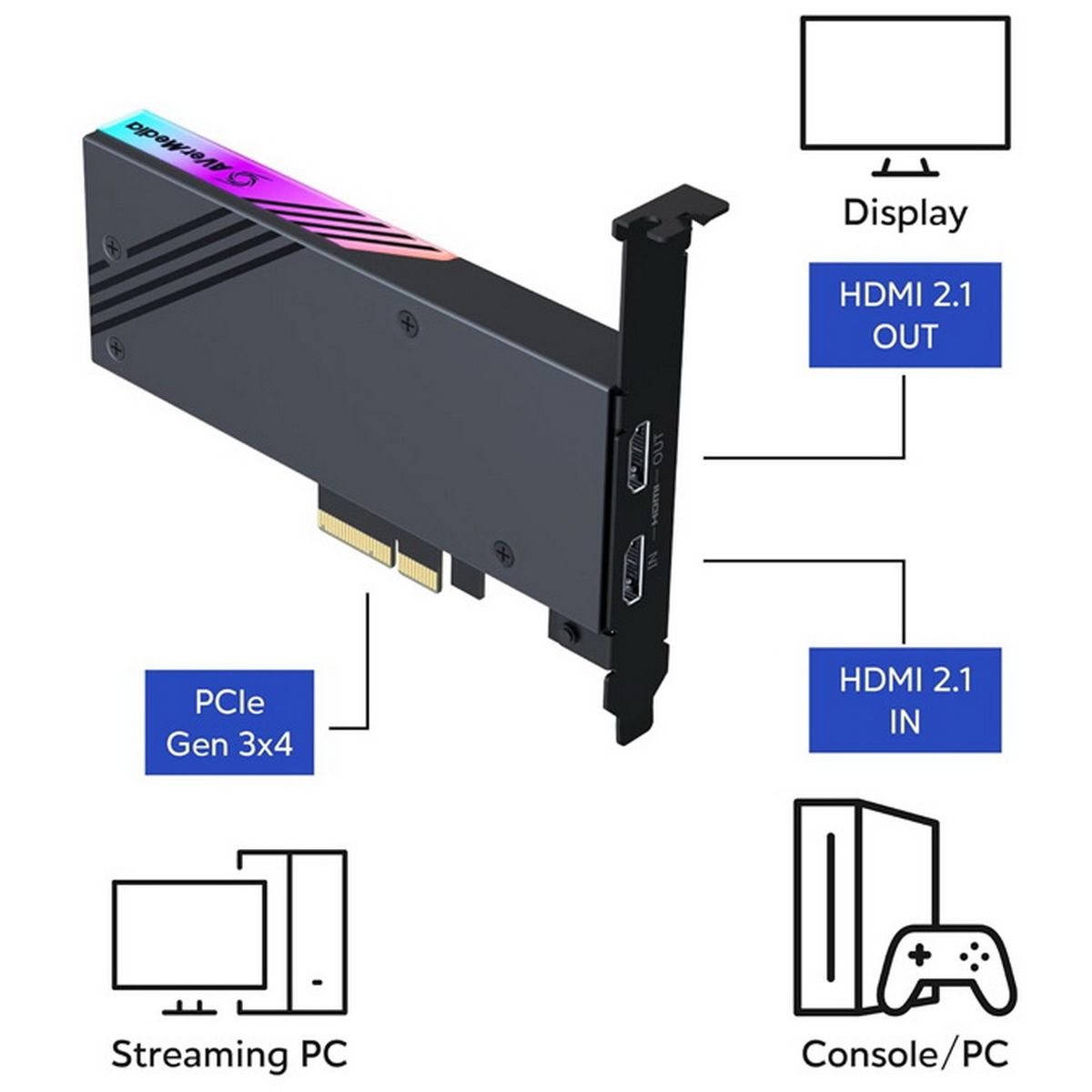 Вход и выход HDMI2.1. Поддержка 4K/120Hz, 1440p/240Hz и 1080p/360Hz HDR/VRR. Макс.разрешение захвата видео - 2160p/60Hz. Форматы видео - YUY2, NV12, RGB24, P010(HDR). Встроенная RGB подсветка