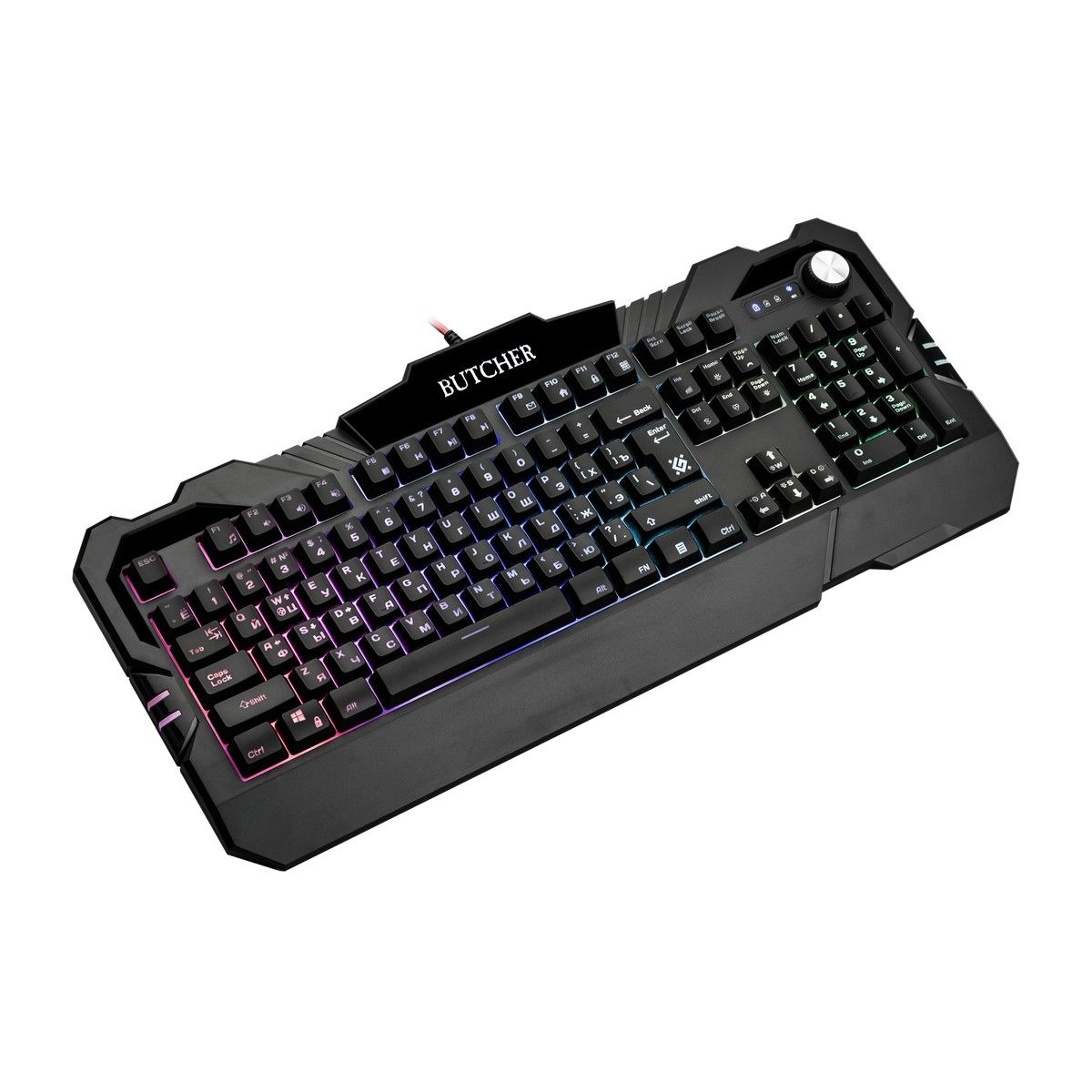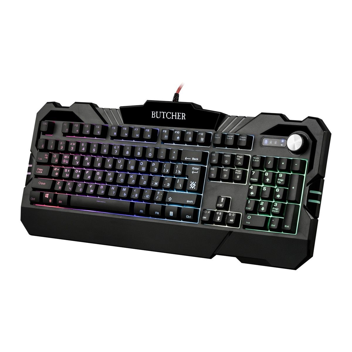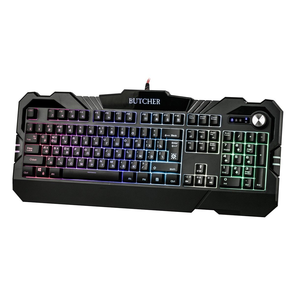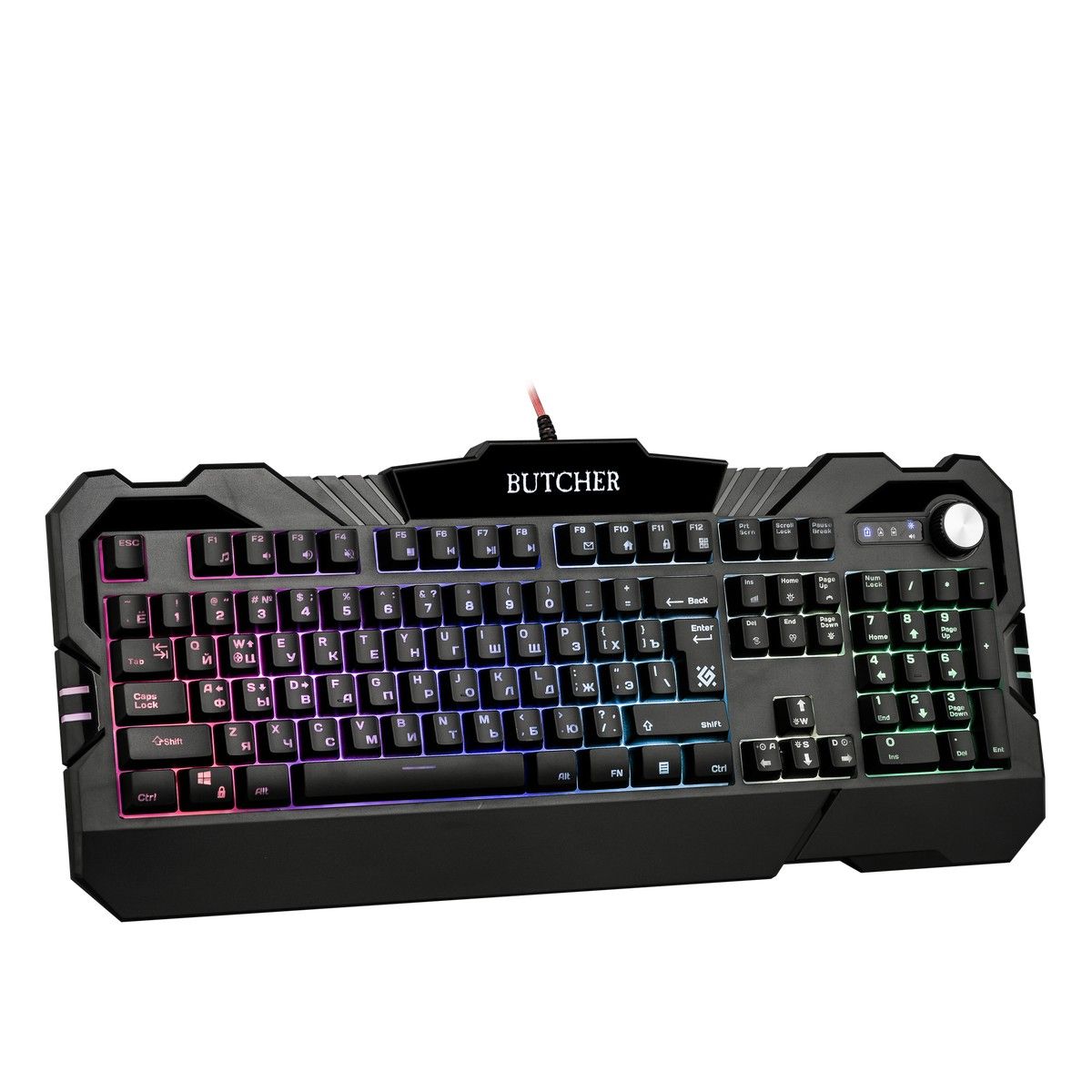 Совместима с Windows 2000/XP/Vista/7/8/10, Mac OS X10. Влагоустойчивая конструкция клавиатуры. Регулятор-кнопка - управление громкостью и подсветкой. Угол наклона клавиатуры регулируется с помощью ножек - возможность поднимать клавиатуру на 2 уровня