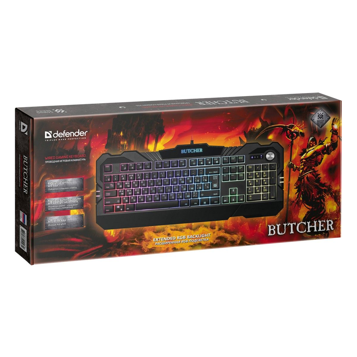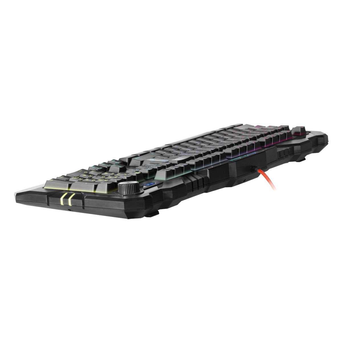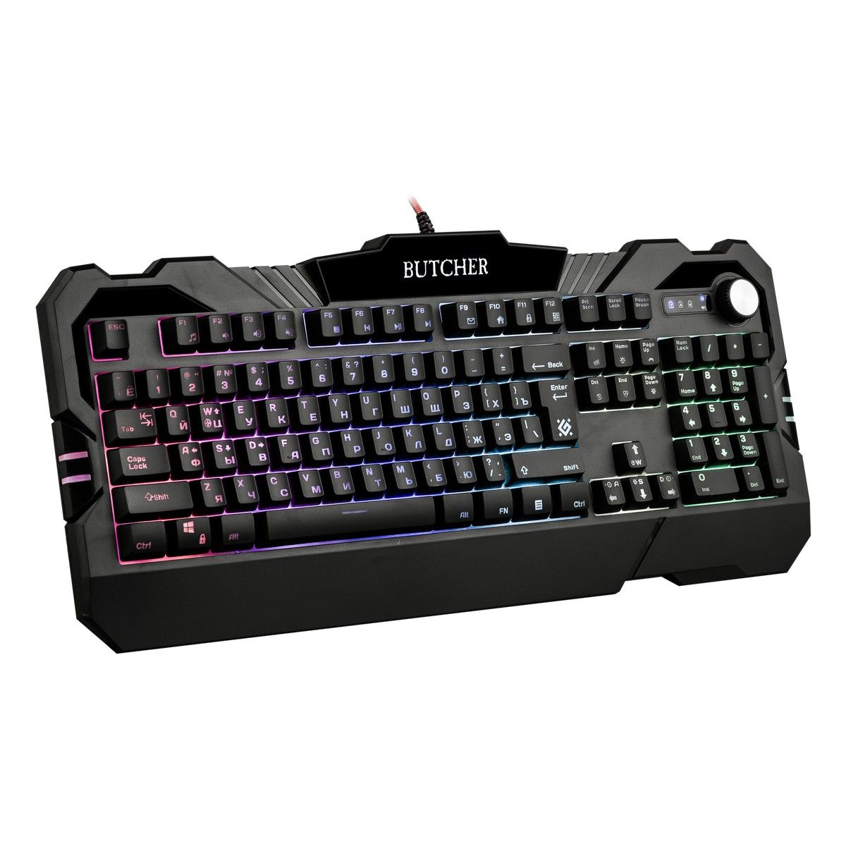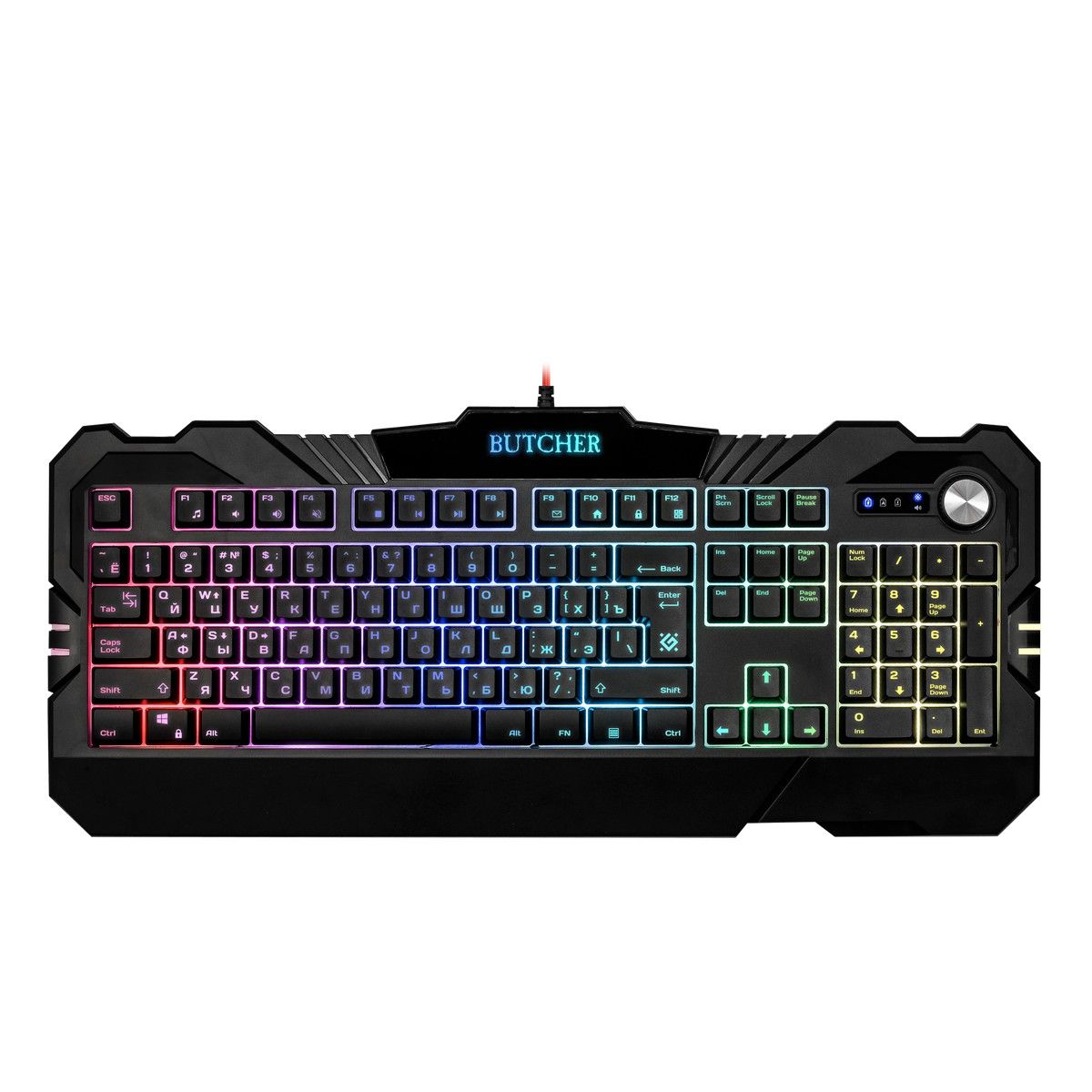 Совместима с Windows 2000/XP/Vista/7/8/10, Mac OS X10. Влагоустойчивая конструкция клавиатуры. Регулятор-кнопка - управление громкостью и подсветкой. Угол наклона клавиатуры регулируется с помощью ножек - возможность поднимать клавиатуру на 2 уровня