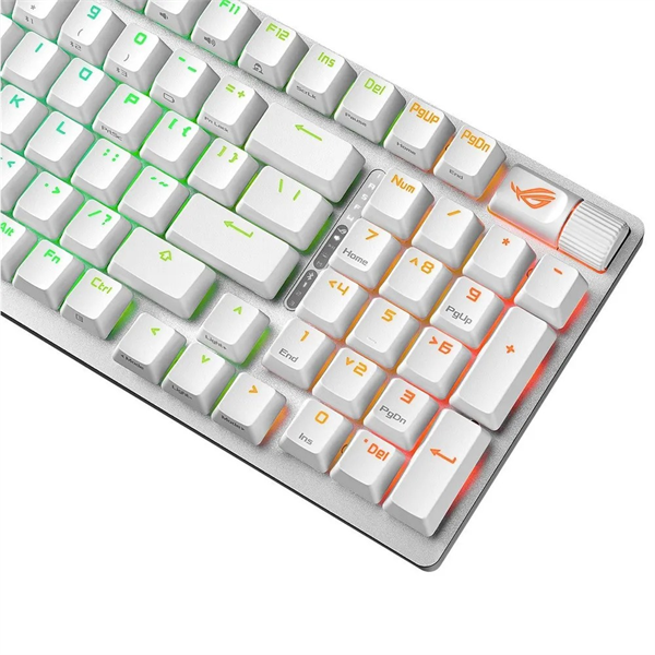 механические переключатели ROG NX Snow и Storm с нанесенной смазкой и поддержкой горячей замены, стабилизаторы ROG, долговечные колпачки из ПБТ, звукопоглощающая пена, три угла наклона