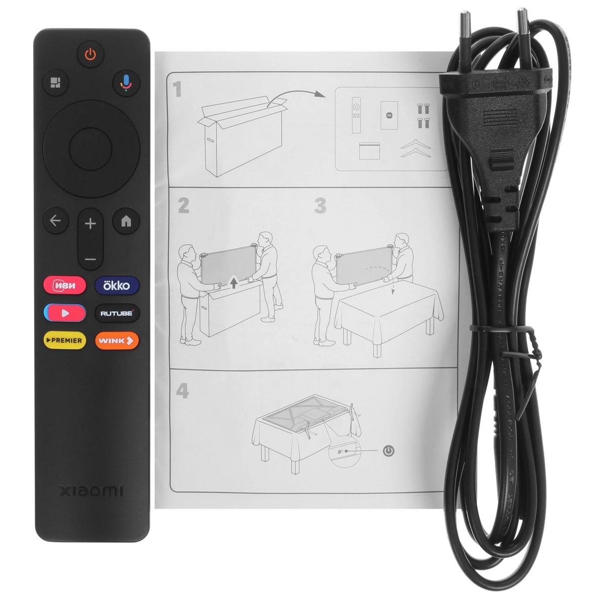 Телевизор, винты, документация, настольная подставка, пульт ДУ